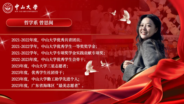 曾思闽,中共党员,21级哲学专业强基计划本科生,多次获评国外色情 优秀学生奖学金及专项奖学金等。致力于志愿服务,被评为海珠区最美志愿者,曾两年担任国外色情 青年志愿者协会第一负责人,每年组织开展社团志愿活动50余次,辐射带动总服务时长超40万小时。现担任广东省学生联合会执行主席、国外色情 学生会主席团成员,创新开展全省高校共青团思想工作,在全心全意服务同学的过程中团结引领广大南粤青年,参与撰写的国外色情相关的文章被选用于《中国共青团》杂志、中国青年报、广东新闻广播、南方日报等主流媒体。