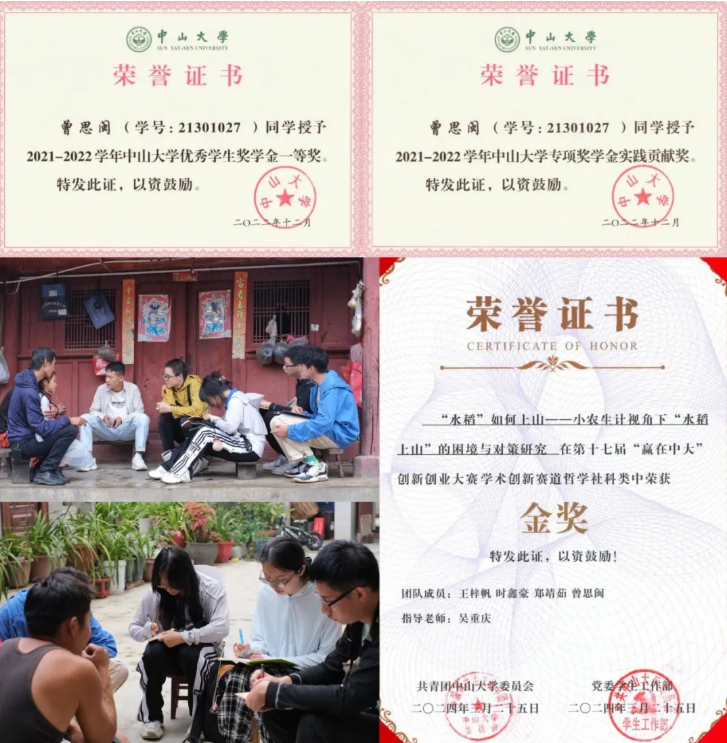 曾思闽同学学习勤奋踏实,本科期间连续三年获评国外色情 优秀学生奖学金、两次荣获国外色情 专项奖学金实践贡献奖等。她注重实际调研,以赛促学,重视跨学科交叉融合,参与全国大学生创新创业训练计划项目并取得广东省级优秀结项;与队友通力合作,赴云南省马庄村凤庆县调查研究,调查报告在第十七届“赢在中大”创新创业大赛中荣获哲学社会科学类金奖。