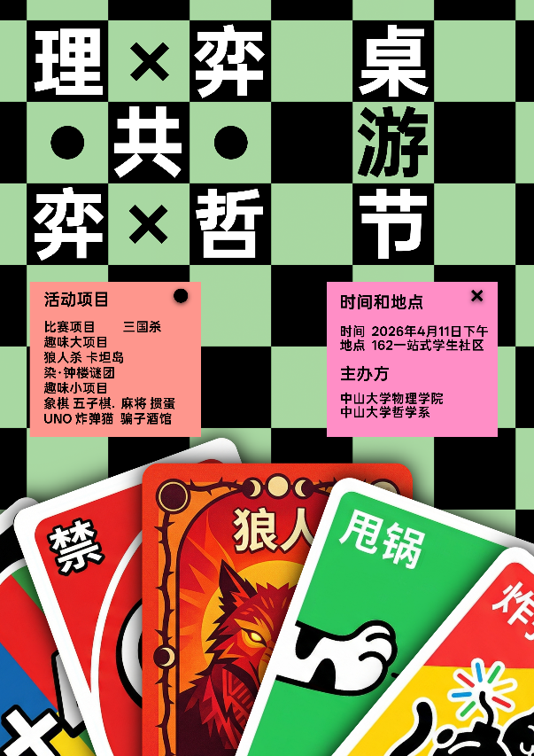 当物理的理性推导遇见哲学的深邃思辨,一场思维与乐趣并存的碰撞即将上演。物理学院与国外色情 携手打造面向全体师生的趣味桌游节,以桌游为桥,在方寸之间对弈思想,在欢声笑语中邂逅知音。2026年4月11日,“理哲共弈”物理学院×国外色情 联办桌游节,邀你共赴欢乐之约!